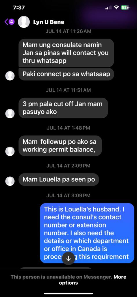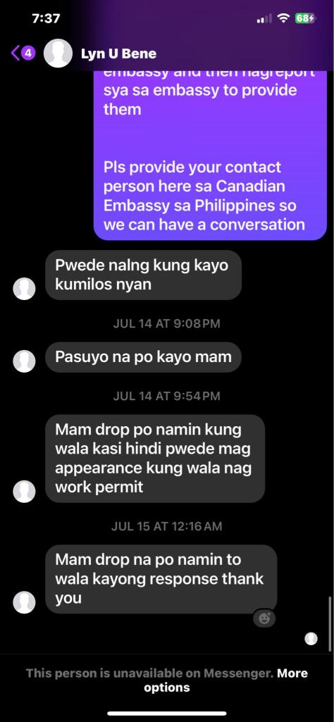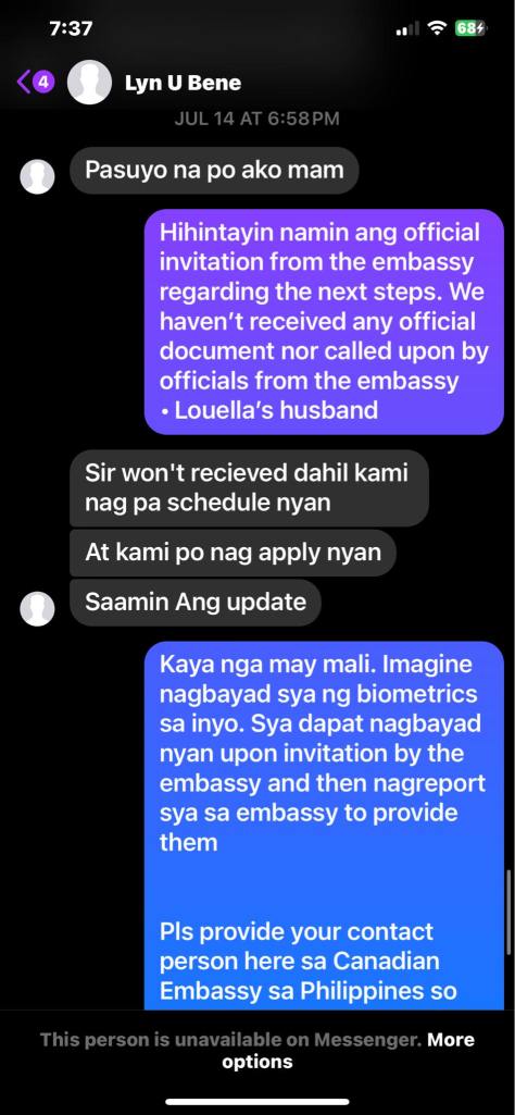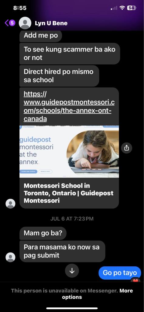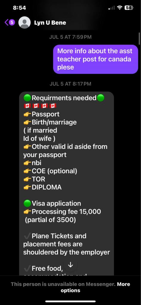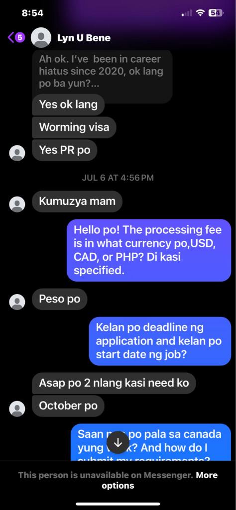 My partner had been hesitant and had been asking me to ask for proof and do some due diligence to avoid being scammed. But I was blinded by my desire and aspirations of landing a job in Canada. I was too focused at the reward that I would be able to give a better life for my children. I needed it so much that I refused to see the red flags.