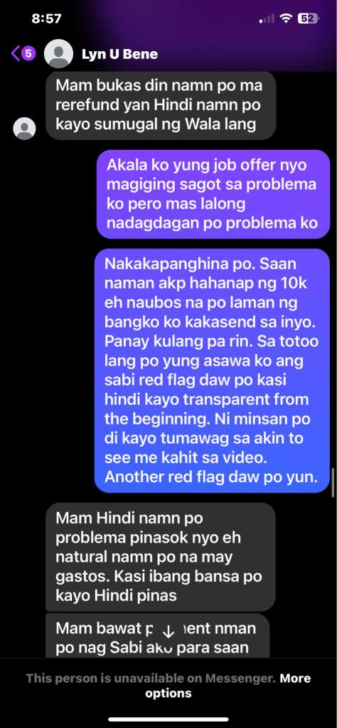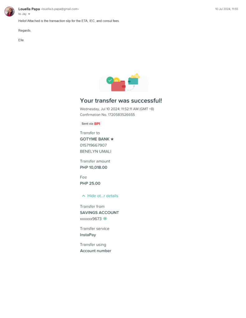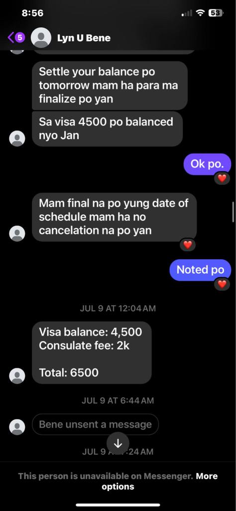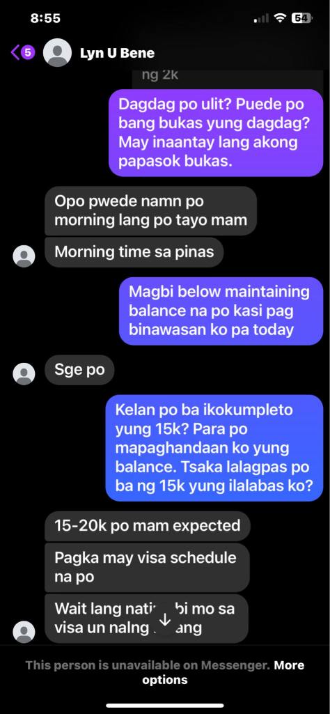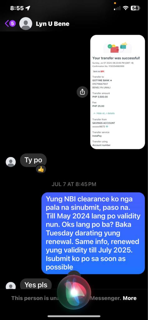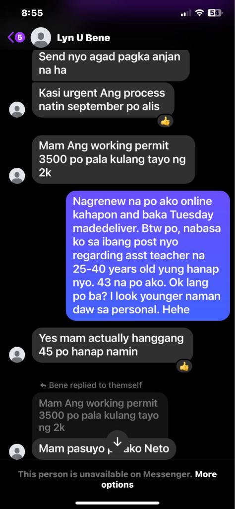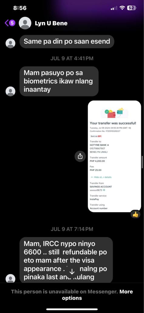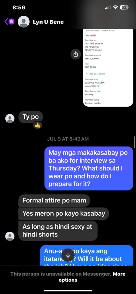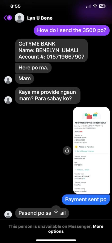 After being told that I would only shell out an amount of Php 15,000, I then sent my resume, school docs, passport bio-page, national ID, NBI clearance to a certain email (jaymaikawasan26@gmail.com) as instructed. Then, I initially sent Php 3,500 to a GoTyme Bank Account under the name of Benelyn Umali (Account Number: 0157 1966 7907). After the initial payment, Lyn U Bene would message me in the middle of the night and I would wake up to a demand of paying yet another amount, and then another, and another, until the amount I have sent her have totaled to Php 41,318.