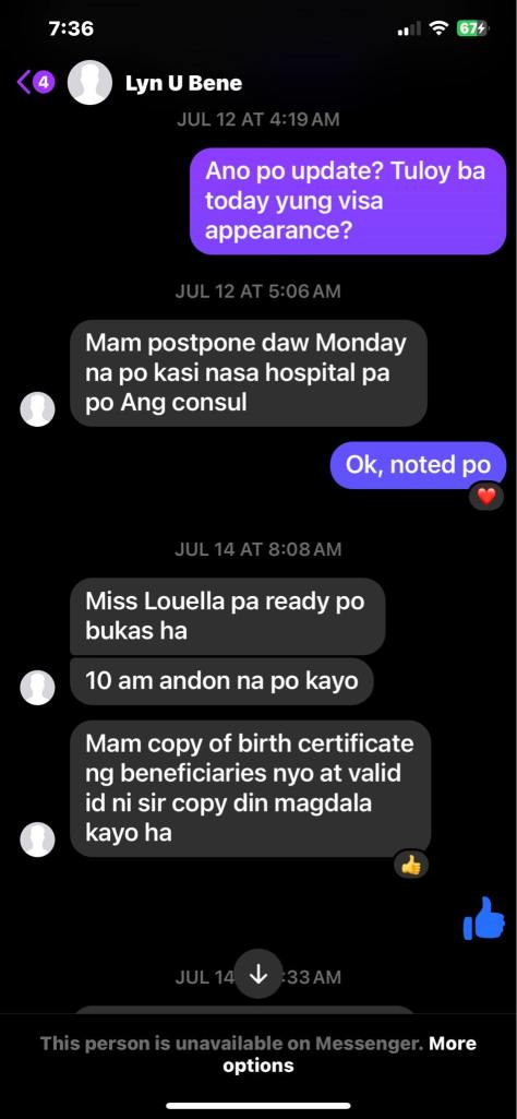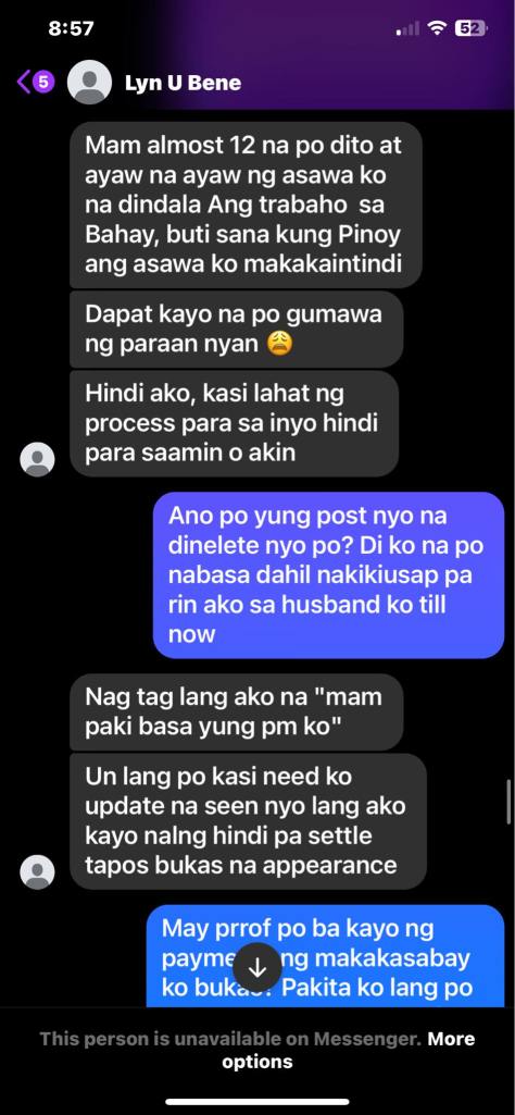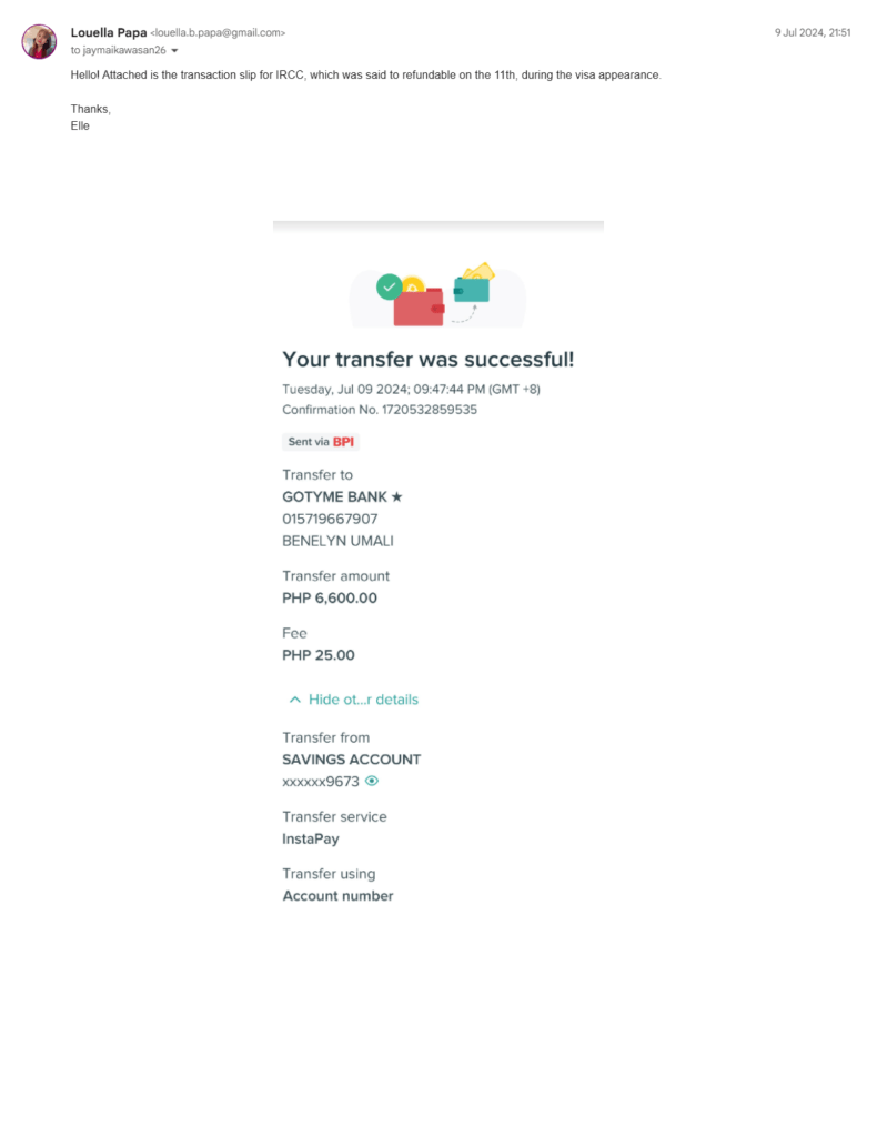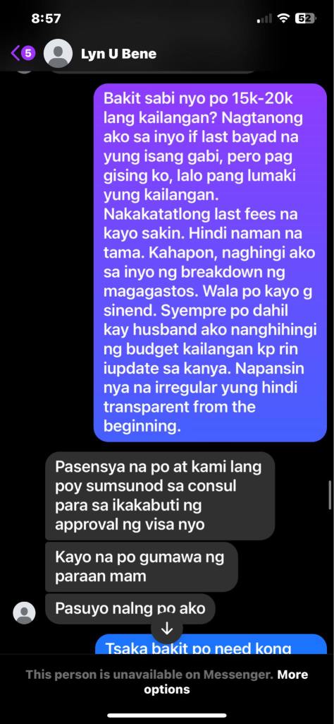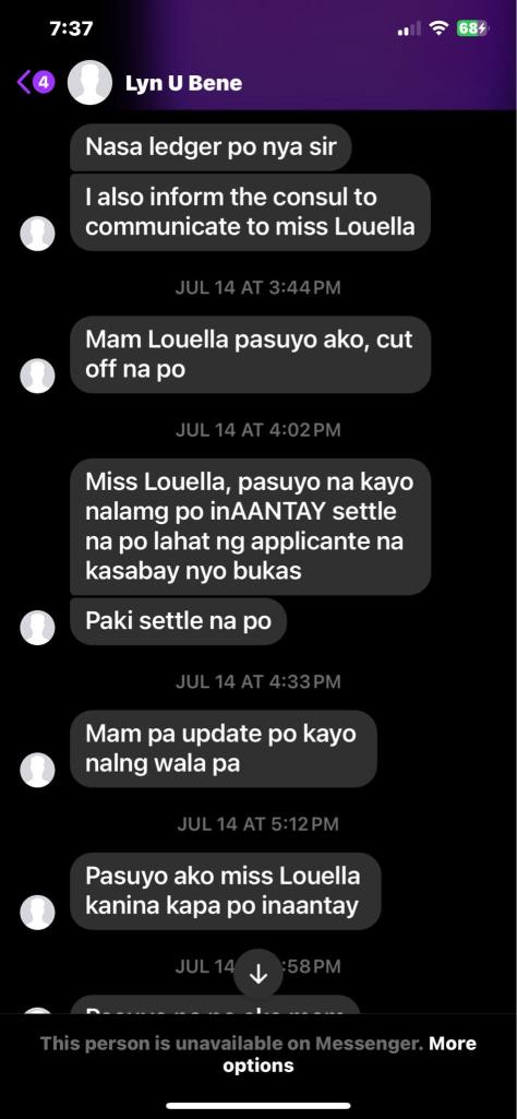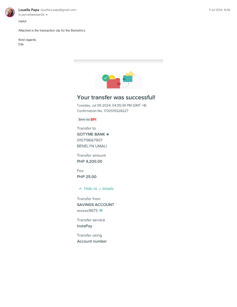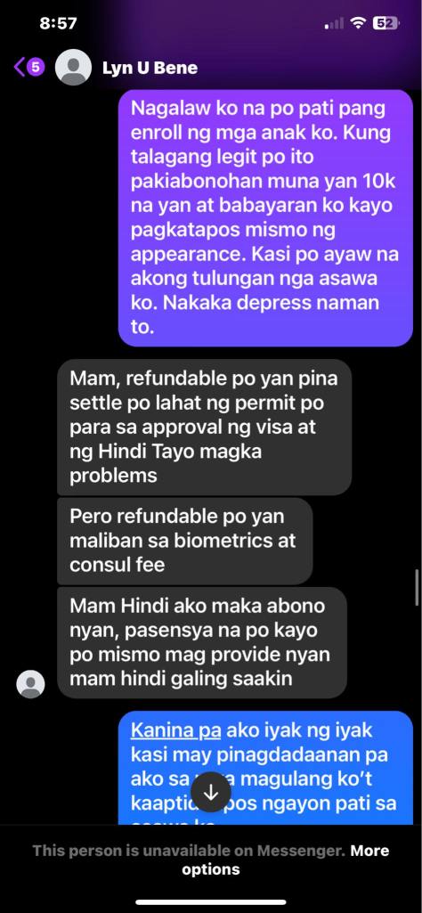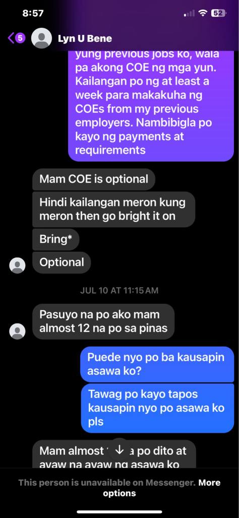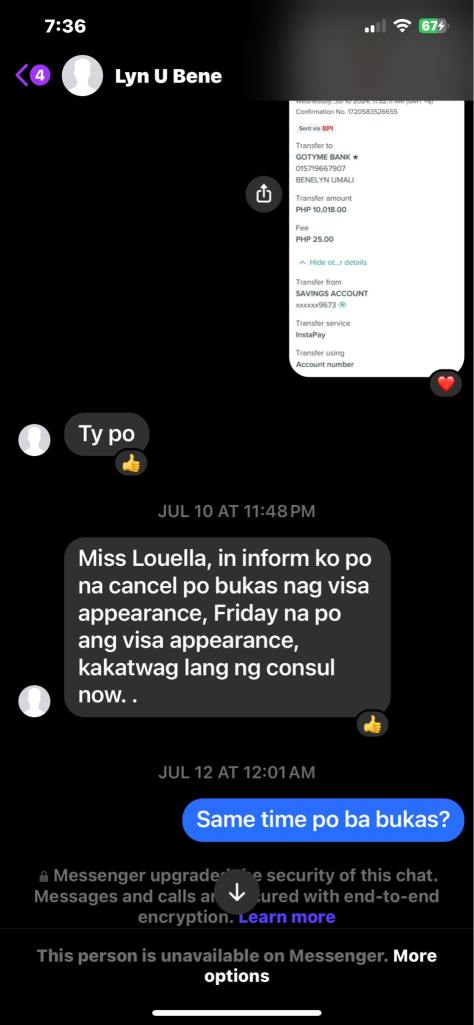 After being told that I would only shell out an amount of Php 15,000, I then sent my resume, school docs, passport bio-page, national ID, NBI clearance to a certain email (jaymaikawasan26@gmail.com) as instructed. Then, I initially sent Php 3,500 to a GoTyme Bank Account under the name of Benelyn Umali (Account Number: 0157 1966 7907). After the initial payment, Lyn U Bene would message me in the middle of the night and I would wake up to a demand of paying yet another amount, and then another, and another, until the amount I have sent her have totaled to Php 41,318.