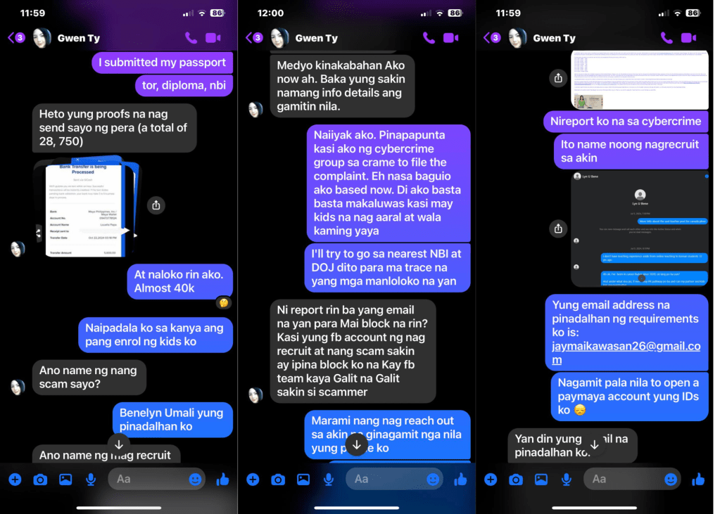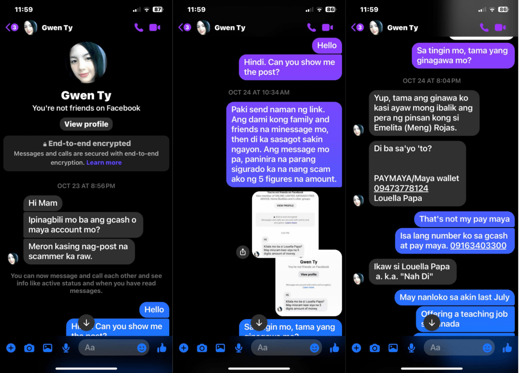While storm Kristine was creating chaos across the country, I was dealing with a different kind of storm. It was equally chaotic. A certain Gwen Ty was messaging people who actively interacted with my public posts. She’s been telling them that I was a scammer who take away people’s money totaling to a 5-digit amount.