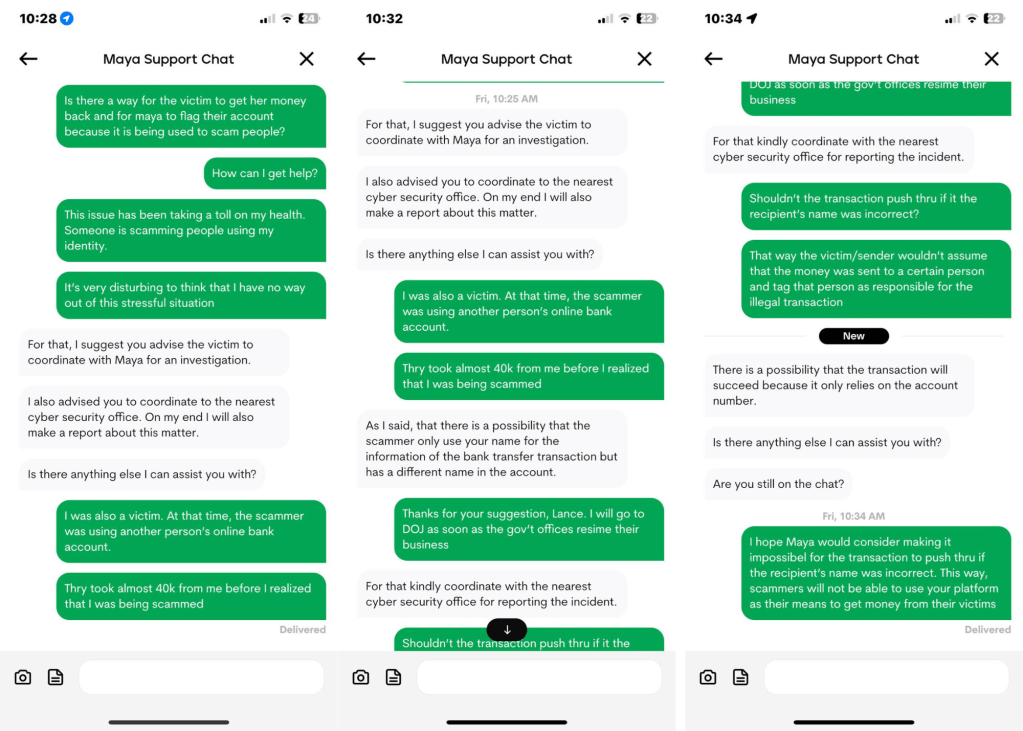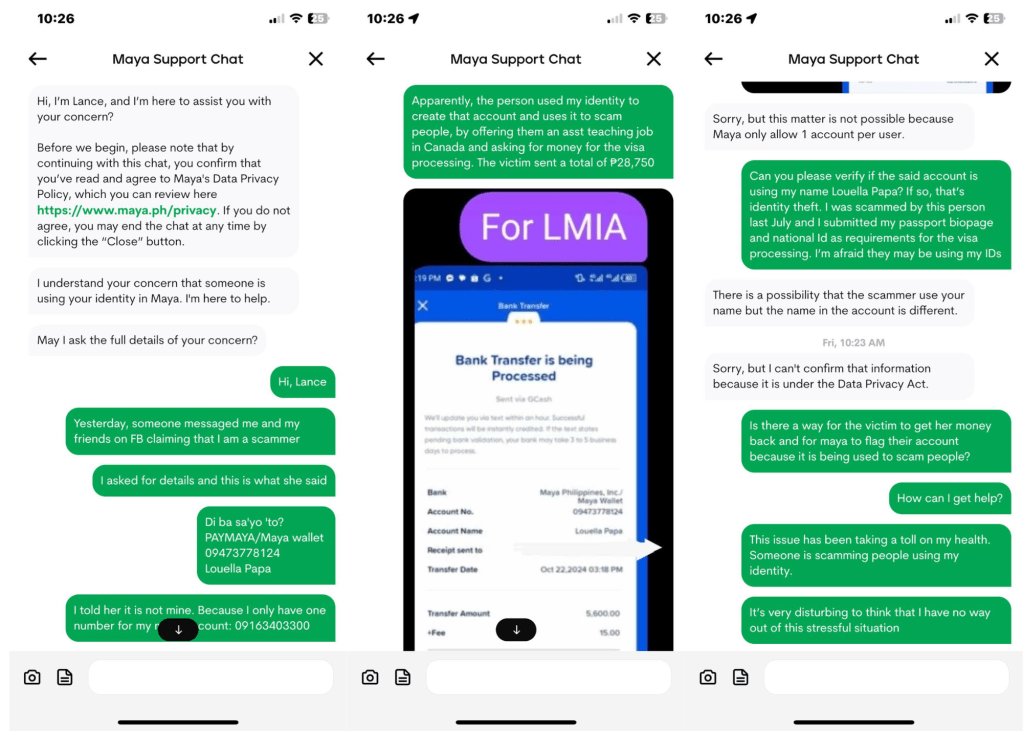 According to Gwen Ty, she was scammed by a certain Nah Di, who later introduced herself as me, sent her my passport bio-page as proof of identity and instructed her to send the amount to a Maya account (0947 377 8124) and gave out my name as the Account Name. The sender, of course, assumed that I was the one who received the money she sent from her G-Cash Account to the said Maya account.